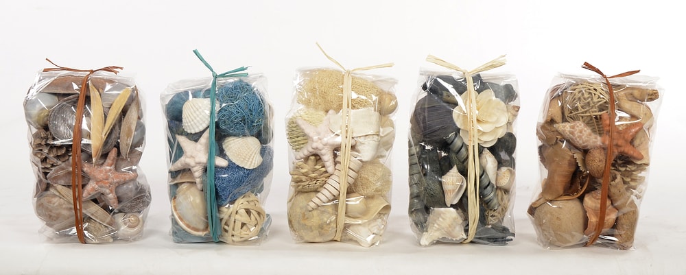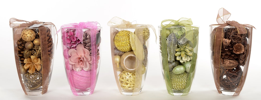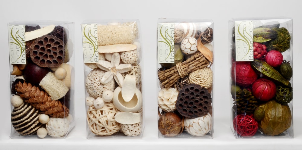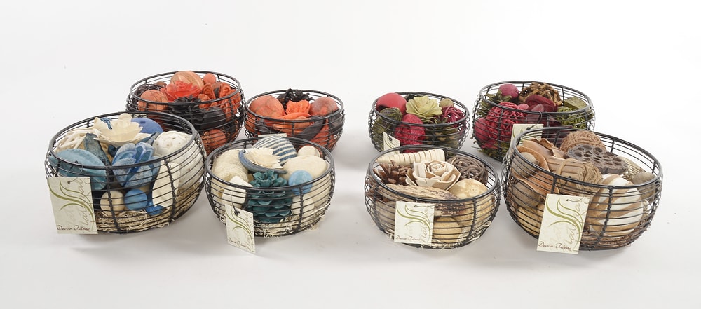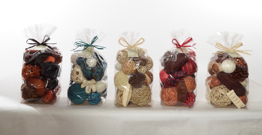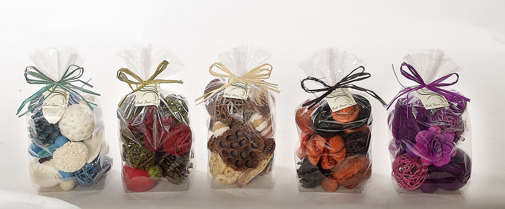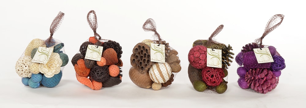 Hand picked botanicals and orbs in an array of colors reflecting seasonal or festive moods. Fragrance can be added to complement any theme of the décor. Available in attractive, retail shelf packaging.